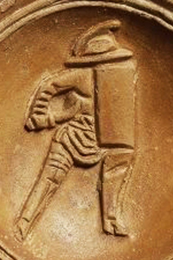 His opponent the MURMILLO mimicked the armament of a Roman legionary: the standard gladius (short sword), and an impressive shield. He wore a short greave, on the left leg only, so that advancing shield-forward, his body would be covered head to toe.